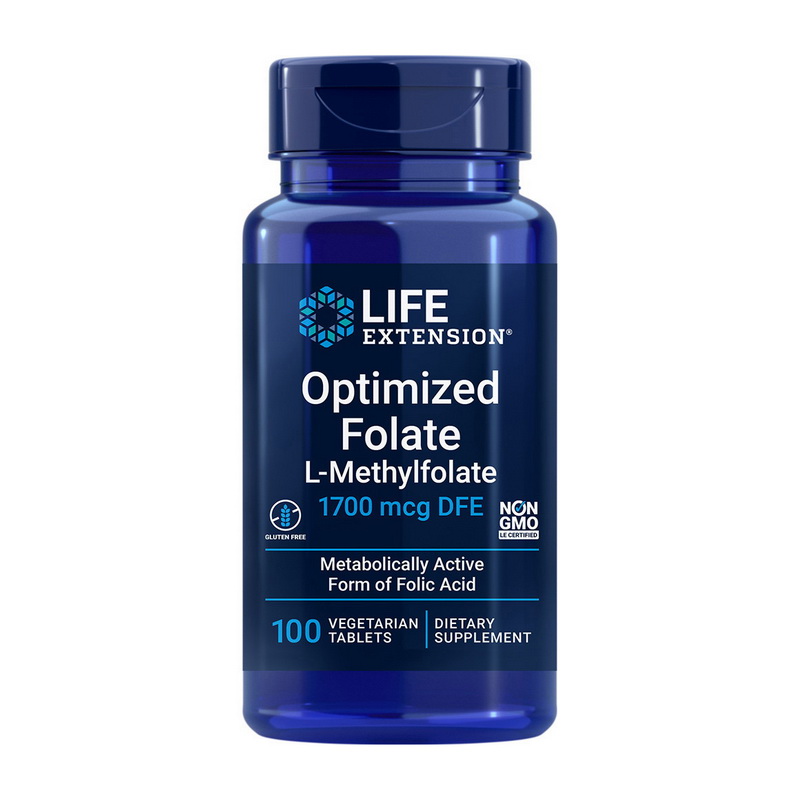 Life Extension Optimized Folat – оптимізована формула фолієвої кислоти сприяє здоров’ю серцево-судинної системи та когнітивних функцій завдяки 1700 мкг фолієвої кислоти у формі 5-L-Methylfolate (5-метилтетрагідрофолат (5-МТГФ)), метаболічно активної форми.